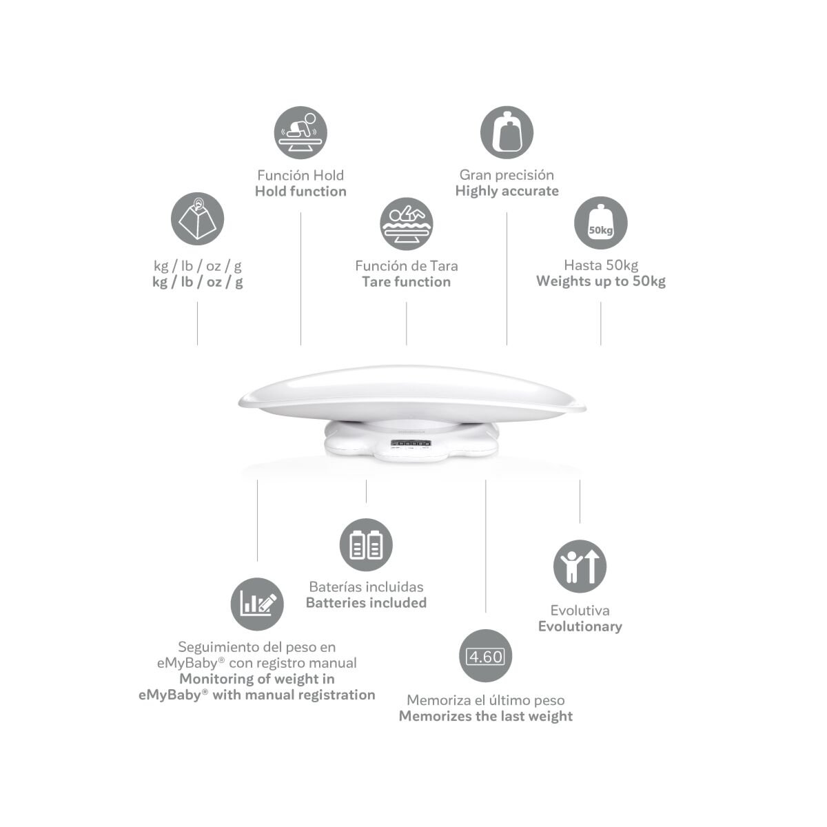 • Permite controlar de forma precisa el peso del bebé: Es capaz de detectar incluso la variación más pequeña en el peso del bebé gracias a su excelente precisión, muy útil para bebés recién nacidos o con problemas de peso.