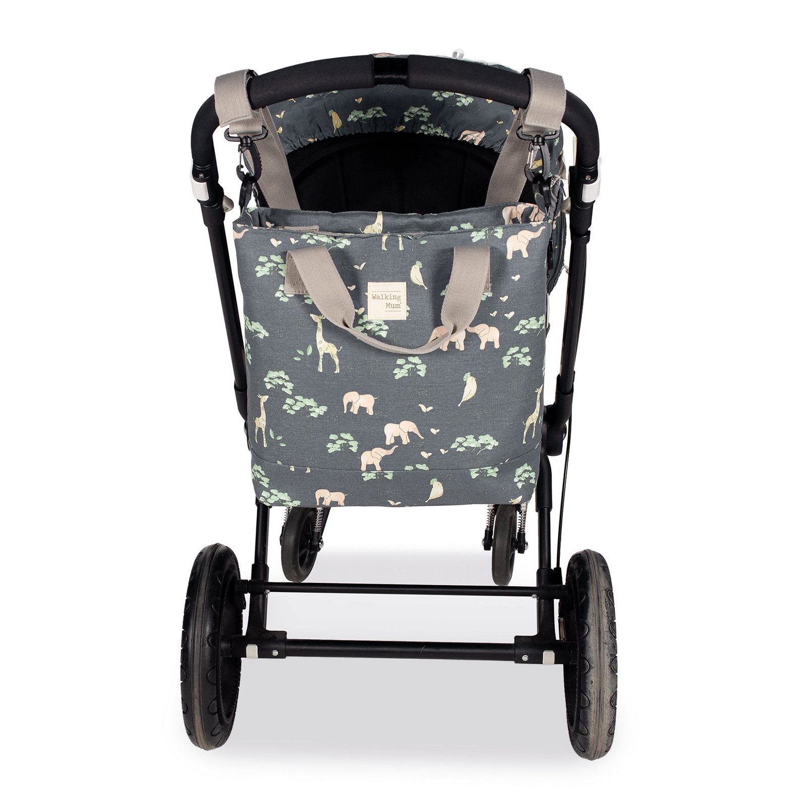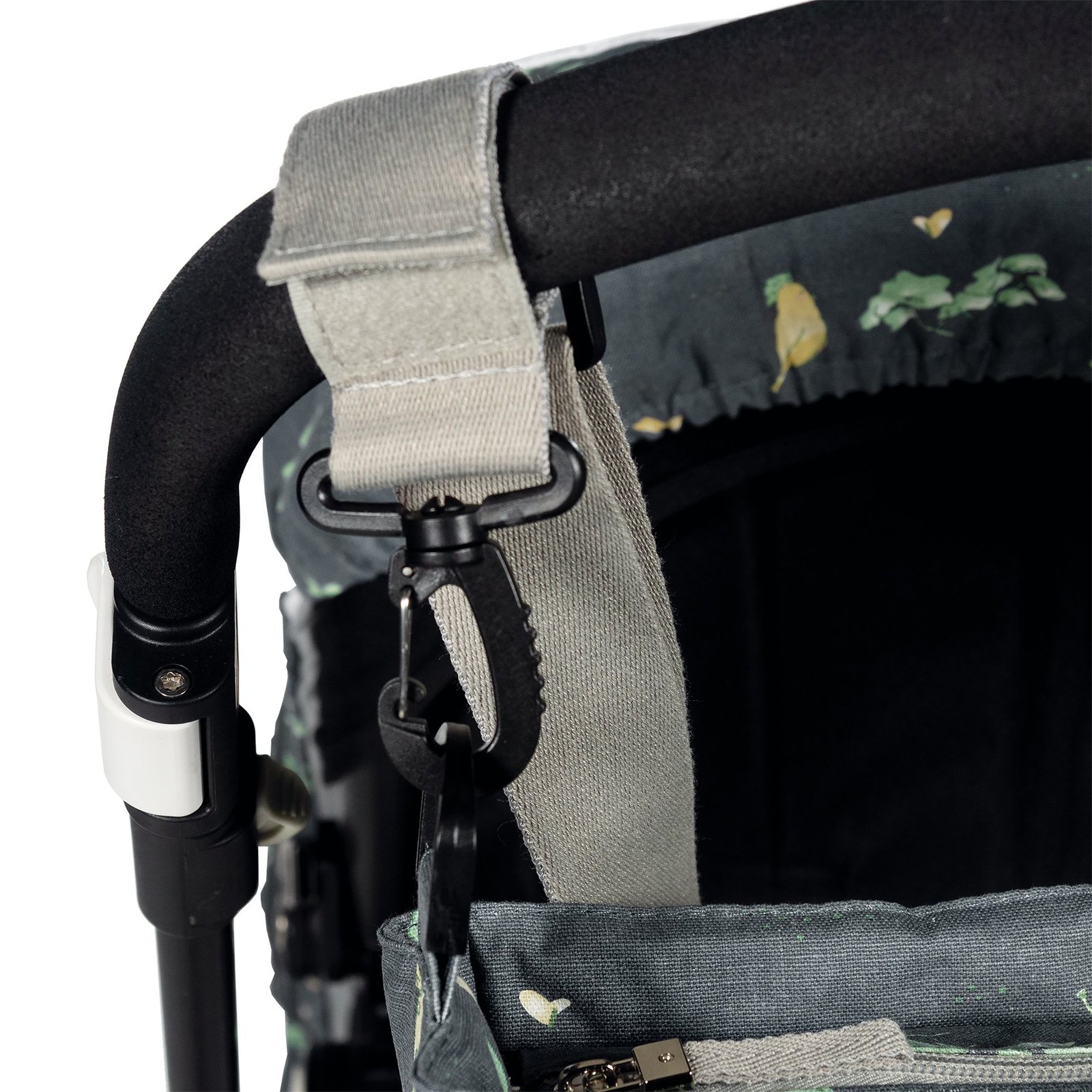 - La bolsa tiene un sistema universal de fijación, con 2 asas cortas ajustables que facilita la colocación en cualquier modelo de silla de paseo.