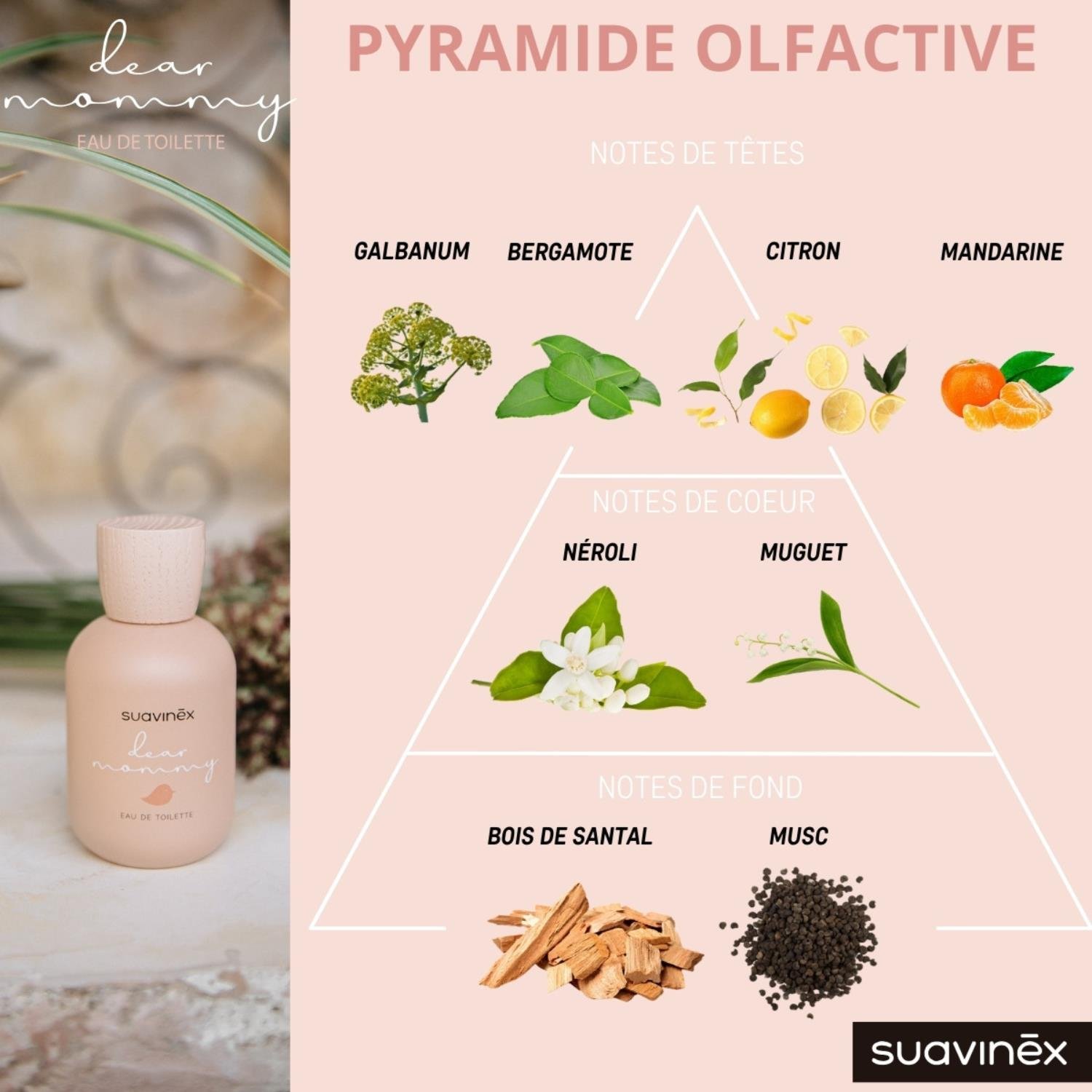 - Dear Mommy, por otro lado, es un canto a la feminidad y fuerza maternal. Sus vibrantes notas cítricas se funden con el neroli y el muguet, descansando en una base rica en sándalo y almizcle.