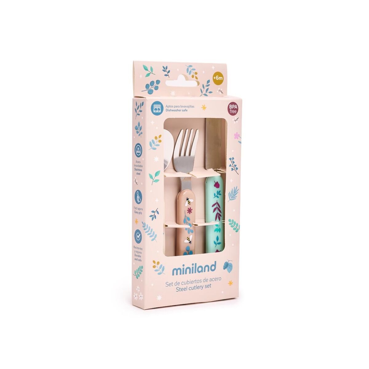 - Steel Cutlery Set Dreamland de Miniland es un set de cubiertos infantiles diseñado para acompañar el aprendizaje del bebé y del niño pequeño durante sus primeras comidas. Su diseño anatómico y evolutivo favorece una transición natural hacia el uso autónomo de los cubiertos.