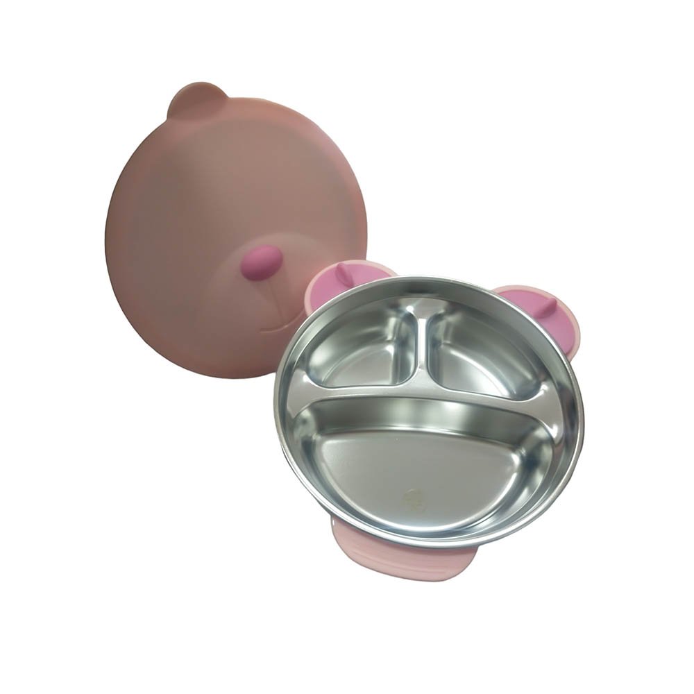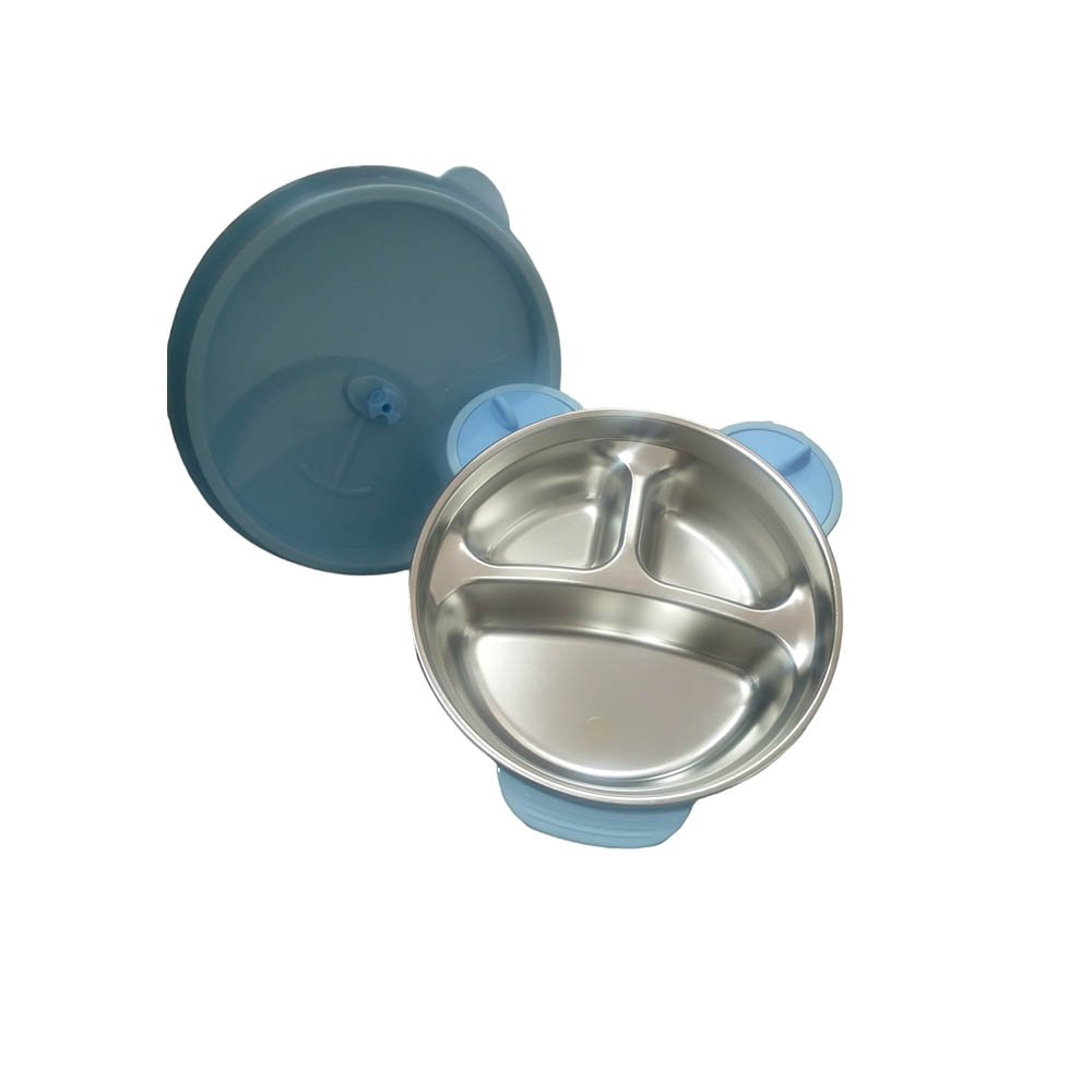 El interior es en acero inoxidable, óptimo para el contacto con alimentos, y gracias a su ventosa anti-vuelcos, se mantiene fijo sobre una mesa o una trona, perfecto para los que empiezan a comer solitos.