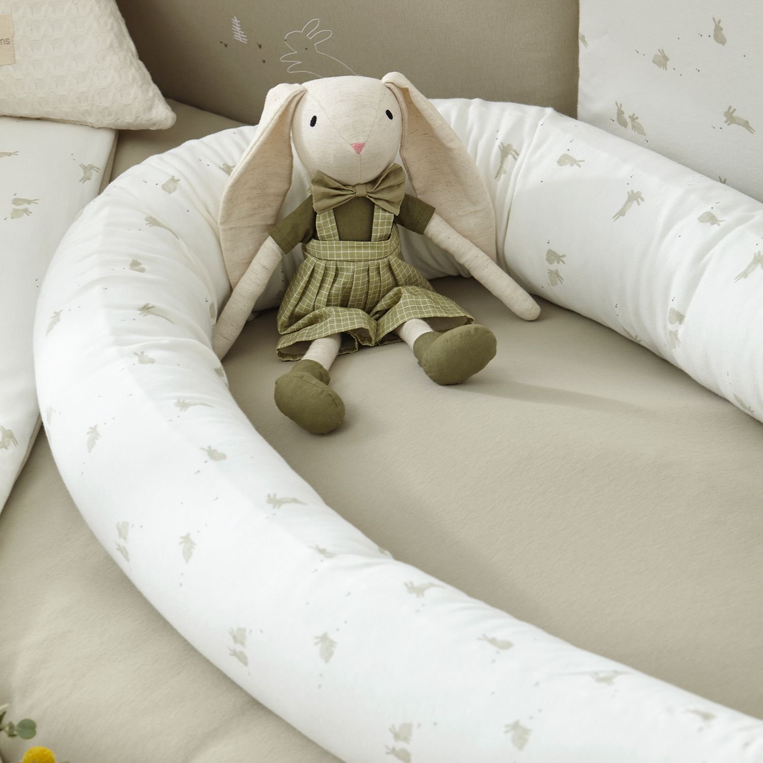 El nido de la colección Bunny de Bimbidreams es un complemento perfecto para los primeros meses del bebé. Diseñado con un tierno estampado de conejitos en tonos suaves y neutros, crea un entorno cálido, delicado y seguro. Su forma envolvente con bordes acolchados proporciona una sensación de protección similar al vientre materno, ideal para descansar, dormir o como reductor de cuna.