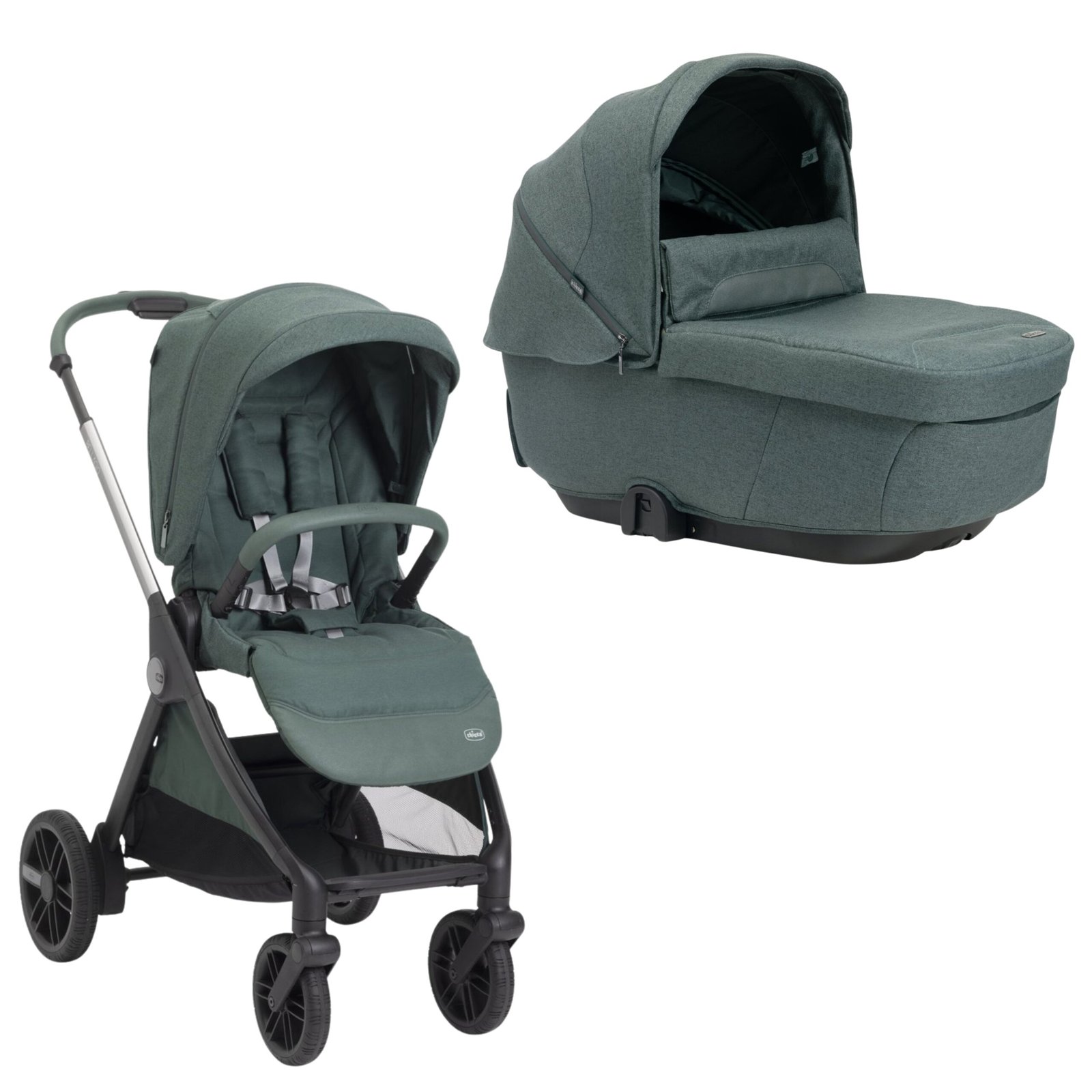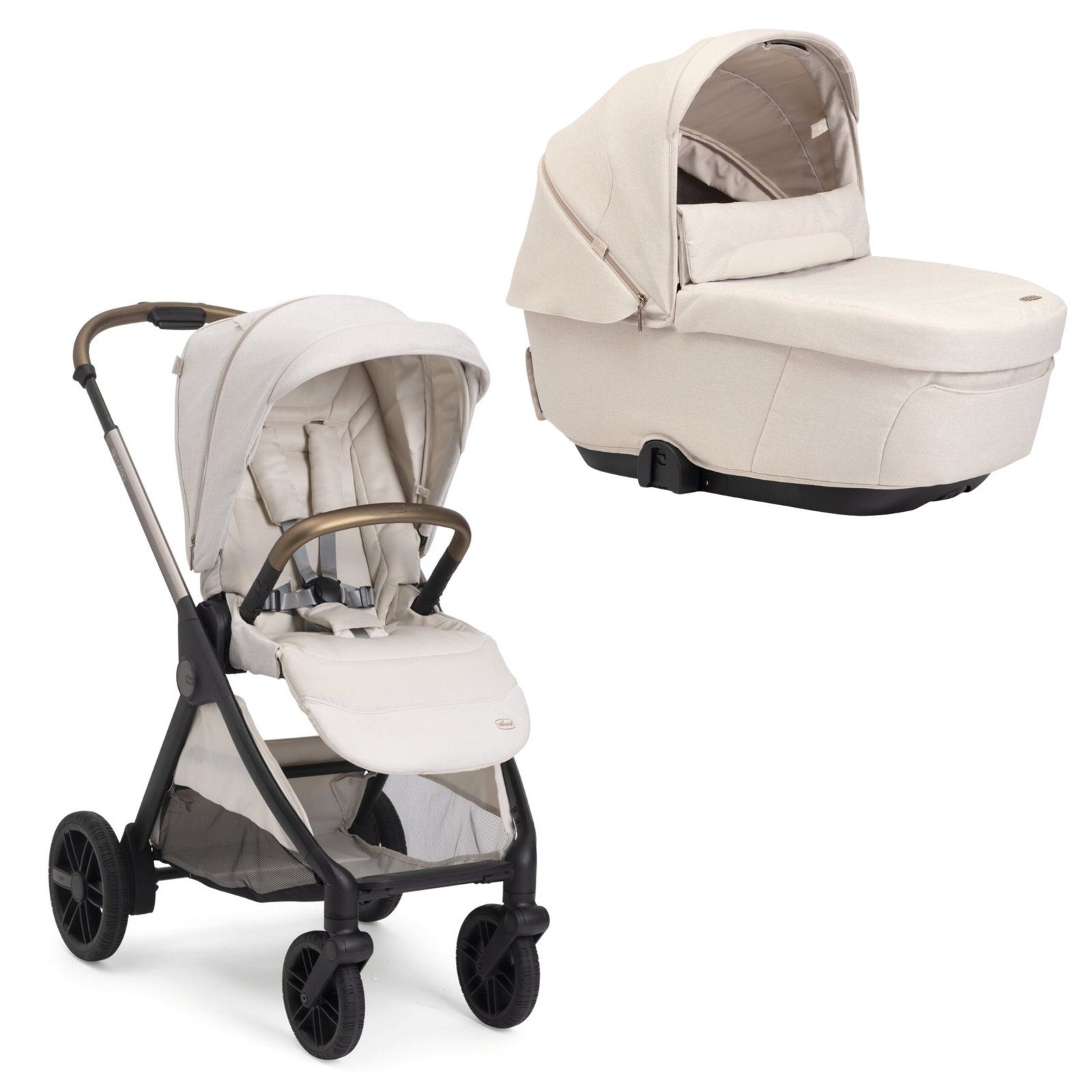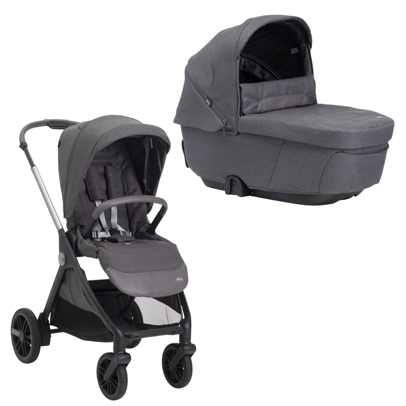 - El capazo destaca por sus detalles premium: placa metálica Chicco, cremalleras reflectantes e inserciones con acabado textil recubierto.