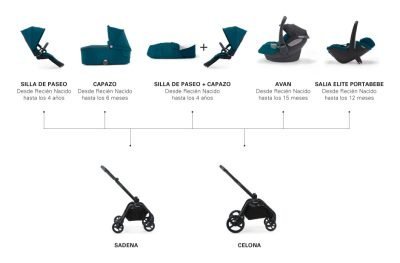 - Accesorios adicionales: Con el adaptador suministrado con el producto, puede transformar el portabebés Sadena en un sistema de viaje.