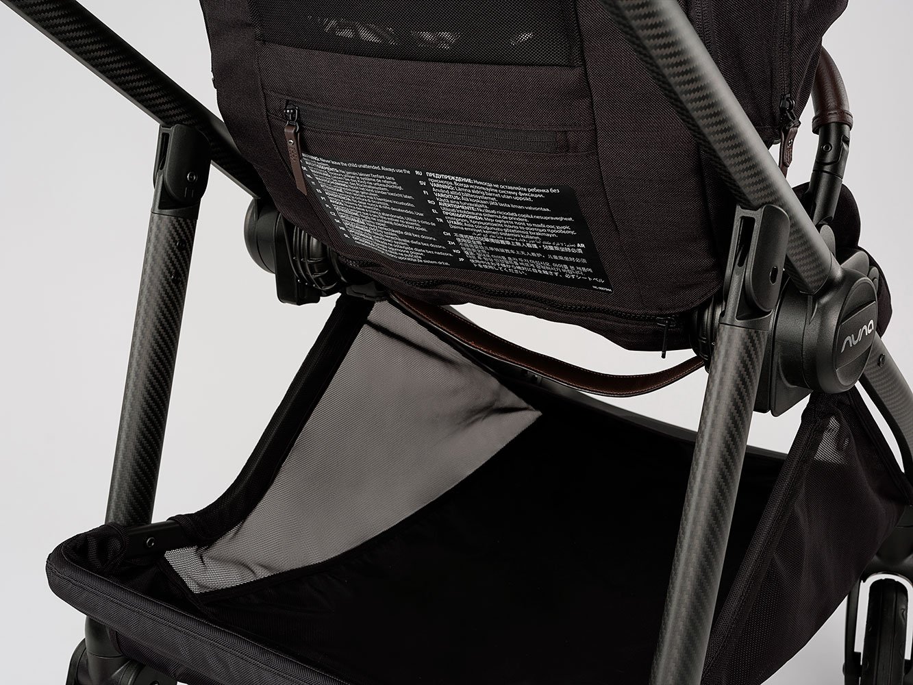 - Gran cesta con capacidad para 10 kg y bolsillo con cremallera en la parte trasera del asiento.