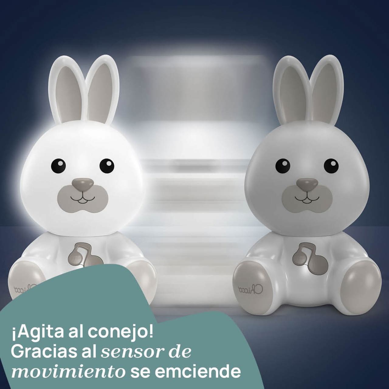 - MELODÍAS: Al pulsar la nota sobre la barriguita del conejo se activan 10 minutos de música clásica y melodías modernas que acompañan al bebé durante los primeros momentos de la hora de dormir, creando una atmósfera serena y tranquilizadora.