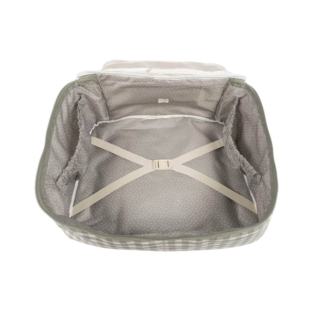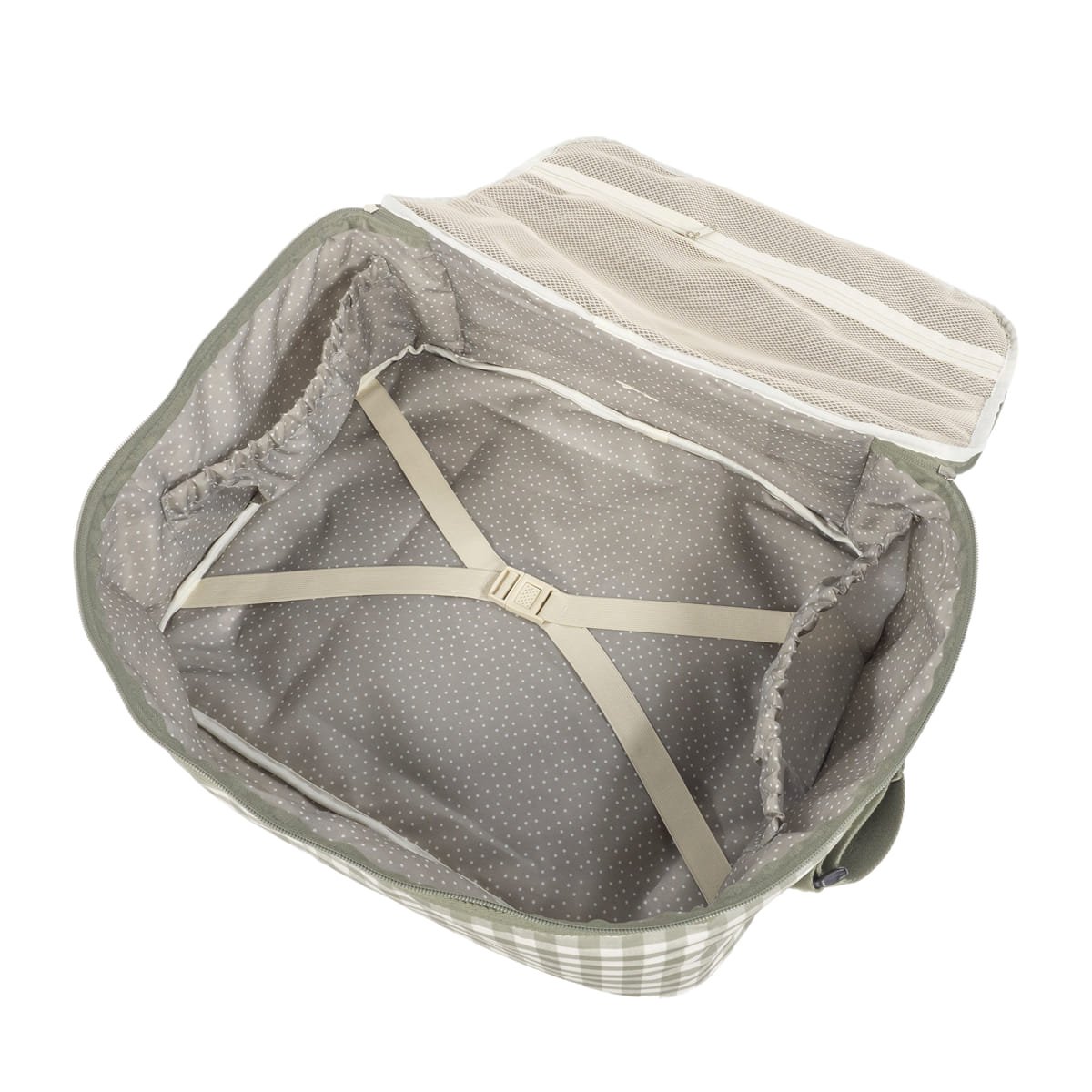 - Además en el compartimiento interior tiene un forro a juego con gomas para contener la ropa y mantener todo en su lugar.