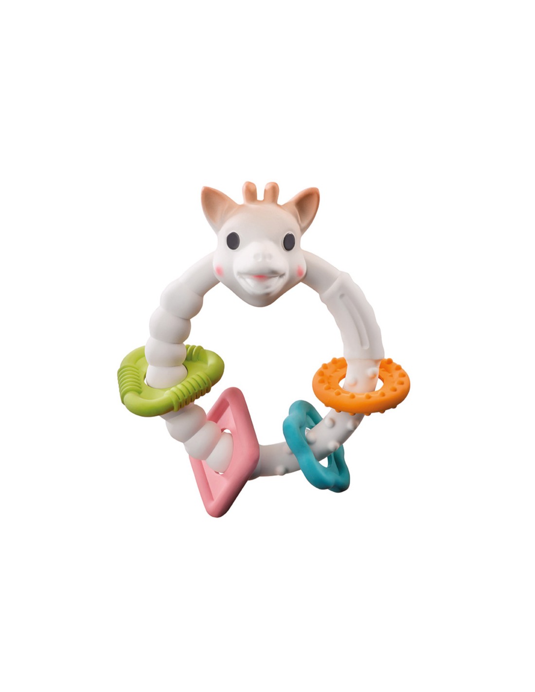 - El set de regalo Sophie la girafe incluye, por un lado, el mordedor para bebés de Sophie la girafe, que es conocido por ser el primer juguete del bebé que despierta todos sus sentidos y el sonajero-mordedor Colo’rings, ambos fabricados en caucho totalmente natural 100% hevea.