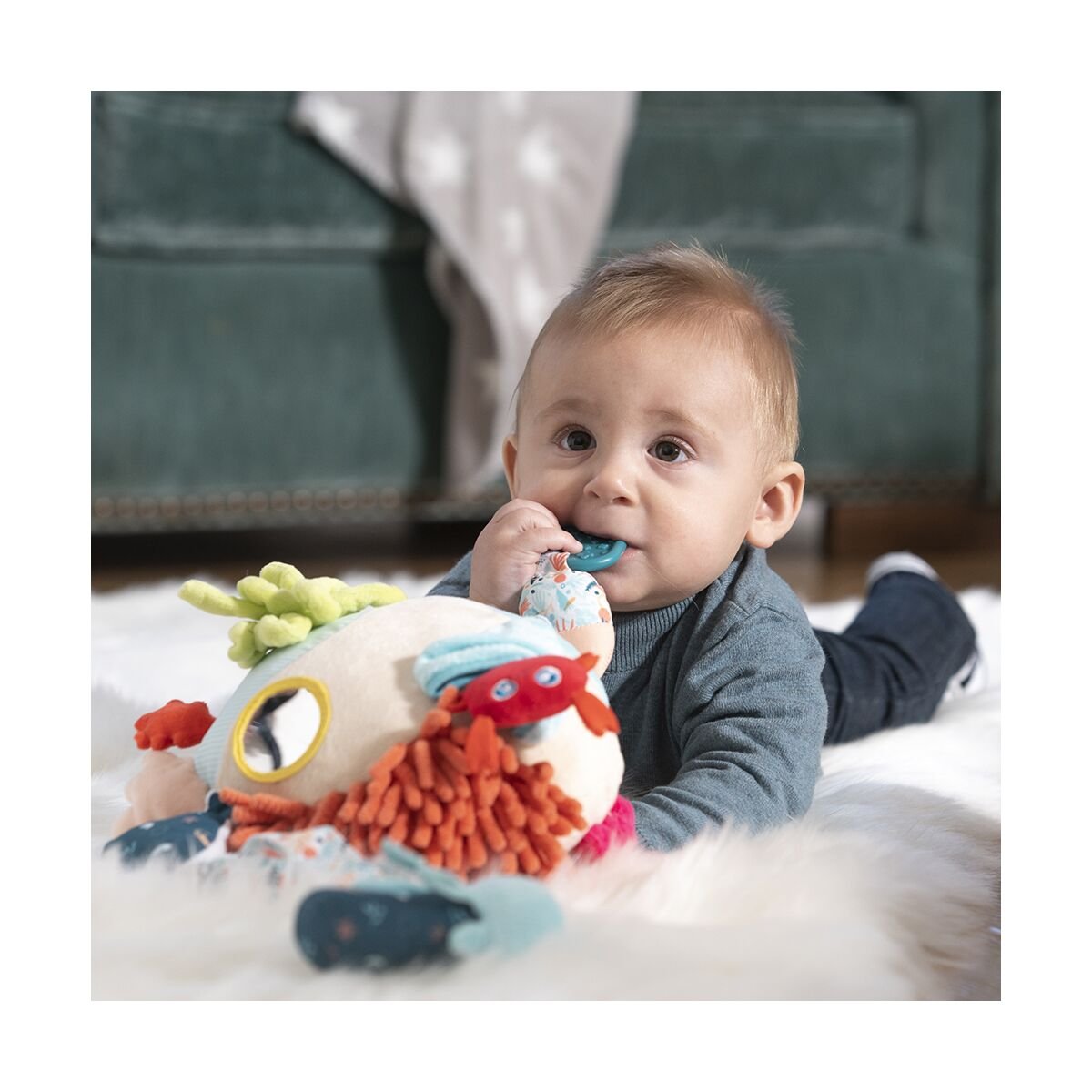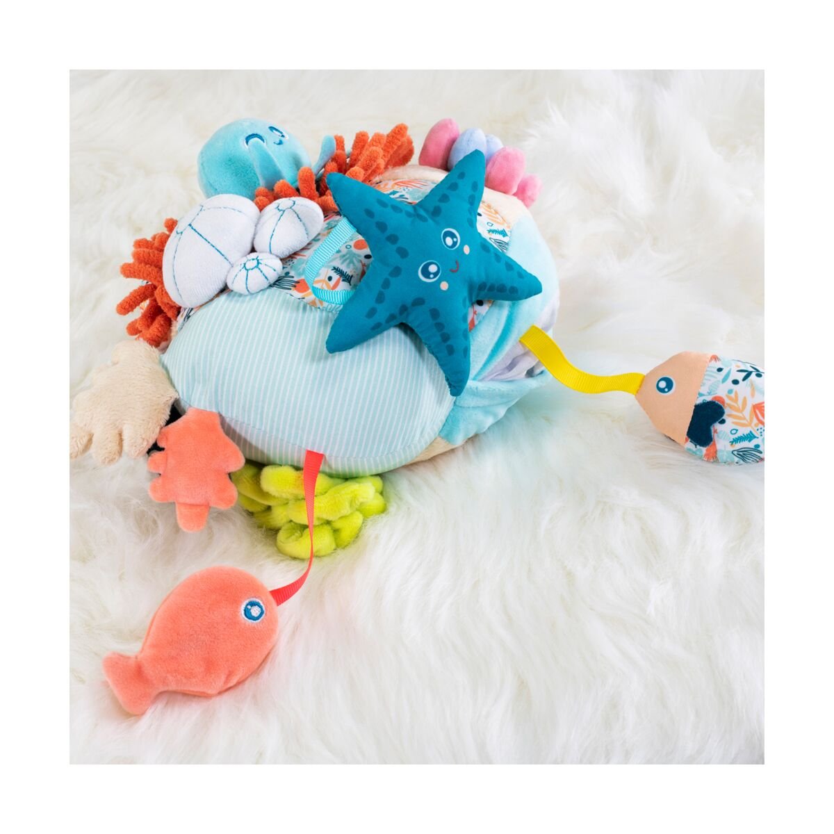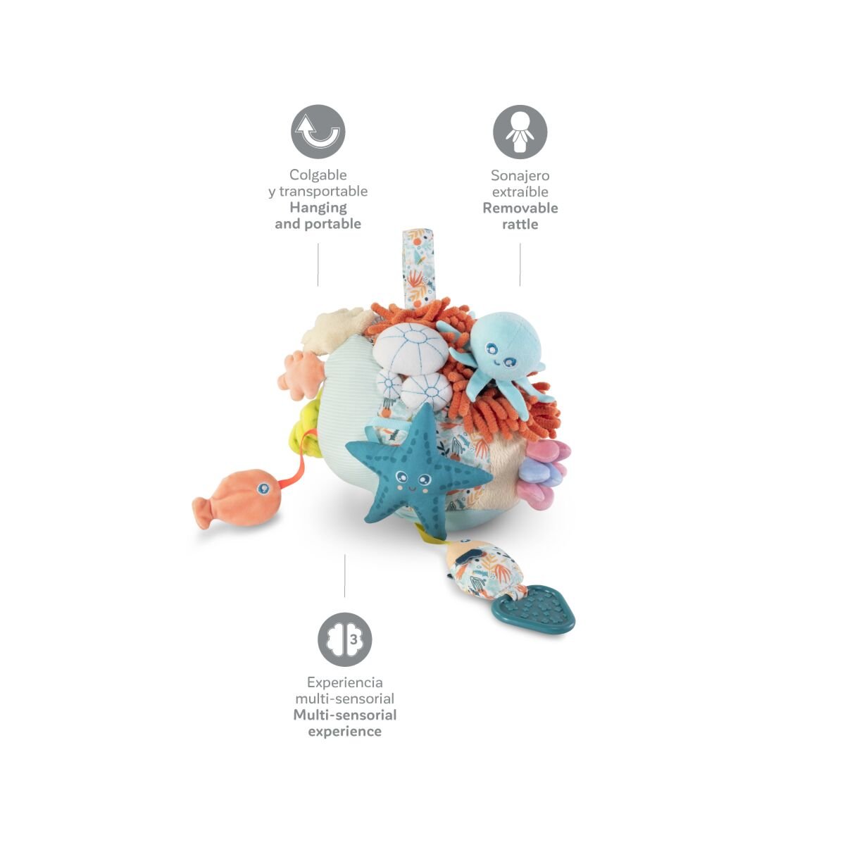 Estimular los sentidos es una de las cosas más importantes y divertidas que puede hacer tu bebé. Lo pasarágenial mirando, tocando, mordiendo y escuchando este arrecife blandito de corales. Le encantaráexplorar sus secretos y agitar su sonajero extraíble con forma de bebépulpo. Además, le ayudaráa familiarizarse con el fondo marino y su importancia desde peque.