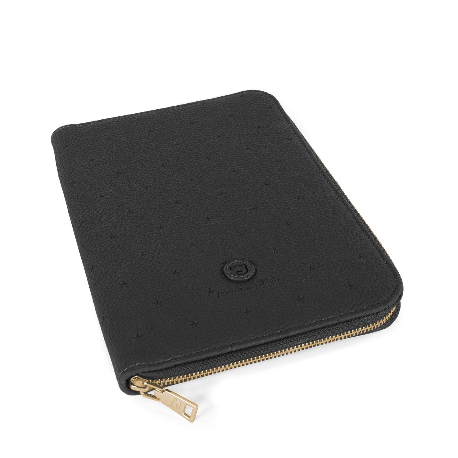 - Este libro portadocumentos esta elaborado en resistente y suave polipiel negra con estrellas grabadas, cuenta con bolsillos en cada lado y está forrado en el interior.