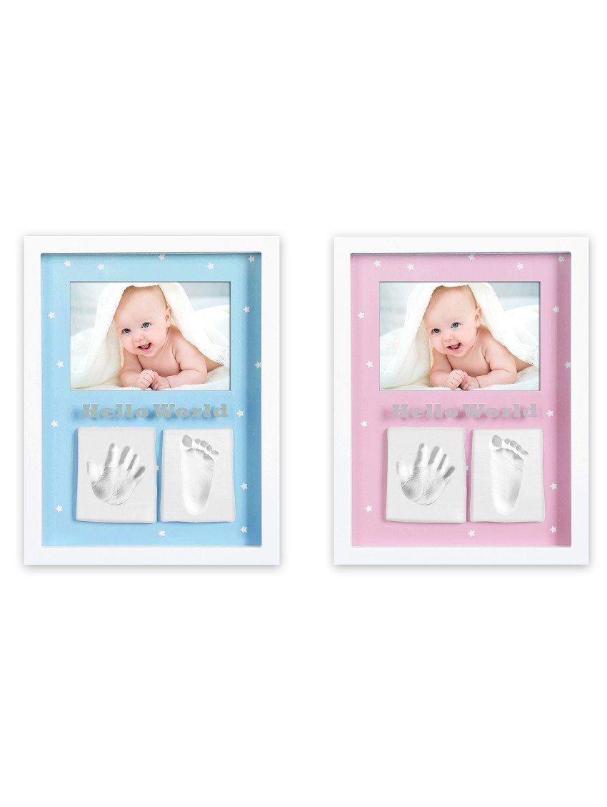 Marco de fotos con sus huellas para crear recuerdos inolvidables de sus primeros días de vida. El marco tiene el fondo reversible para que puedas elegir el color que más te guste.