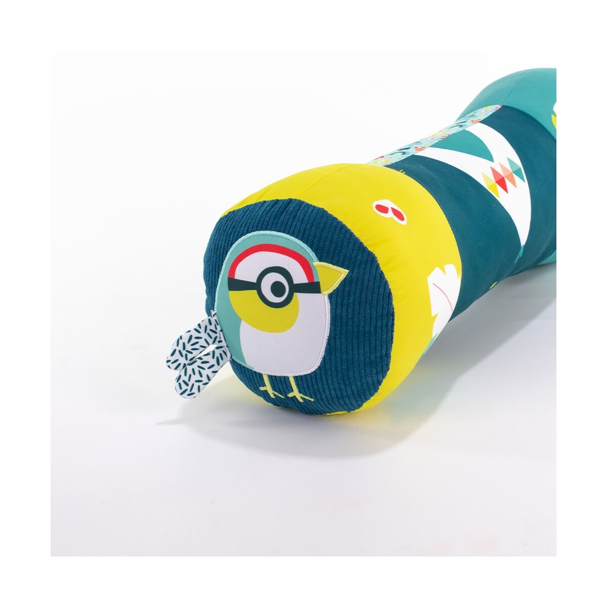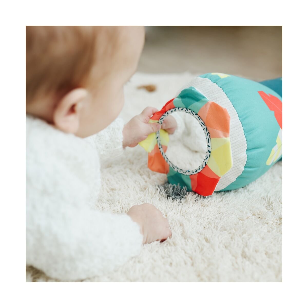• Rodillo blandito y de gran tamaño, que al rodar por el suelo, estimula el gateo y el movimiento autónomo, gracias a sus colores contrastados y al tintineo de su cascabel interior.