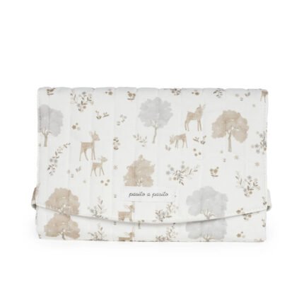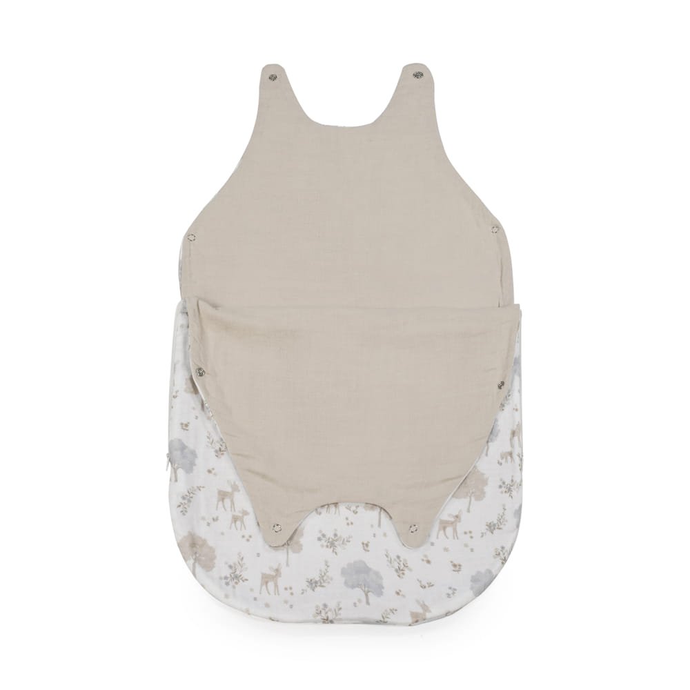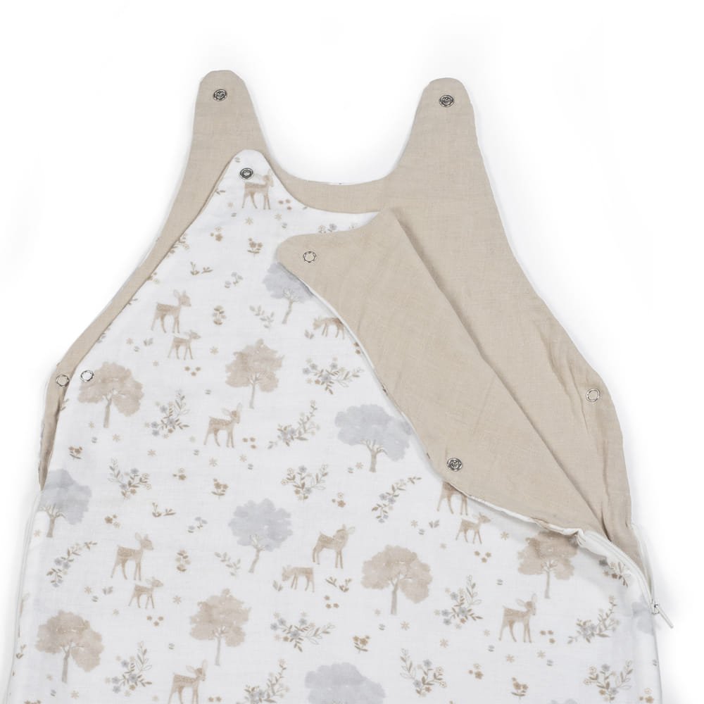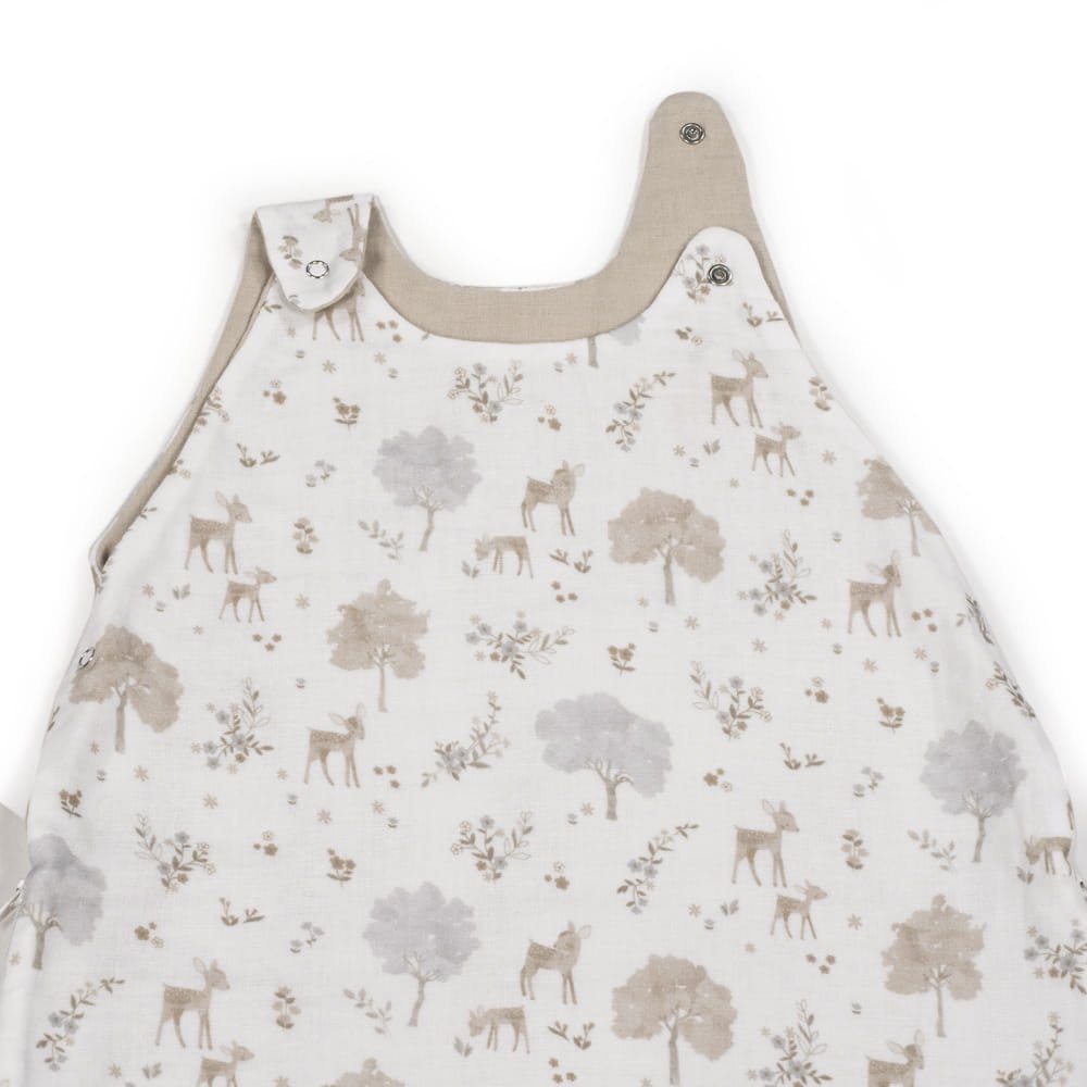 El saco de dormir de verano para bebés Nara de Pasito a pasito ofrece el máximo confort y seguridad para los más pequeños durante sus horas de sueño. Confeccionado en muselina estampada de ciervos y árboles en tonos neutros de algodón 100%, extra suave y transpirable, perfecto para la delicada piel del recién nacido.