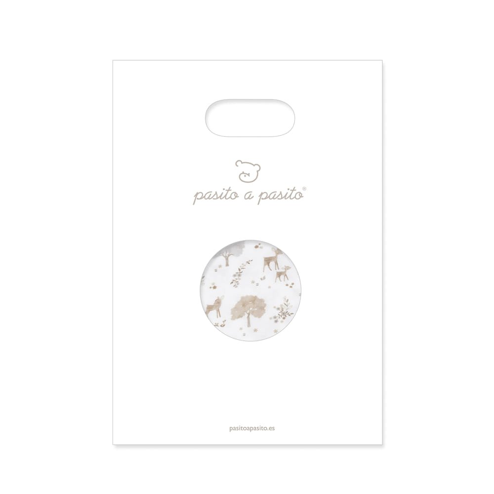 - Confeccionado en muselina estampada de ciervos y árboles en tonos neutros de algodón 100%, extra suave y transpirable, perfecto para la delicada piel del recién nacido.