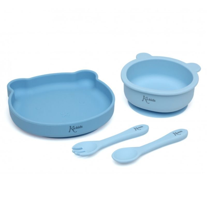 Nuestra vajilla de silicona compuesta de 1 cuenco, 1 plato y unos cubiertos. Está pensada especialmente para el crecimiento de tu peque y que pueda aprender a comer él solo.
