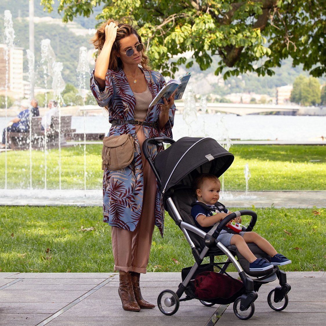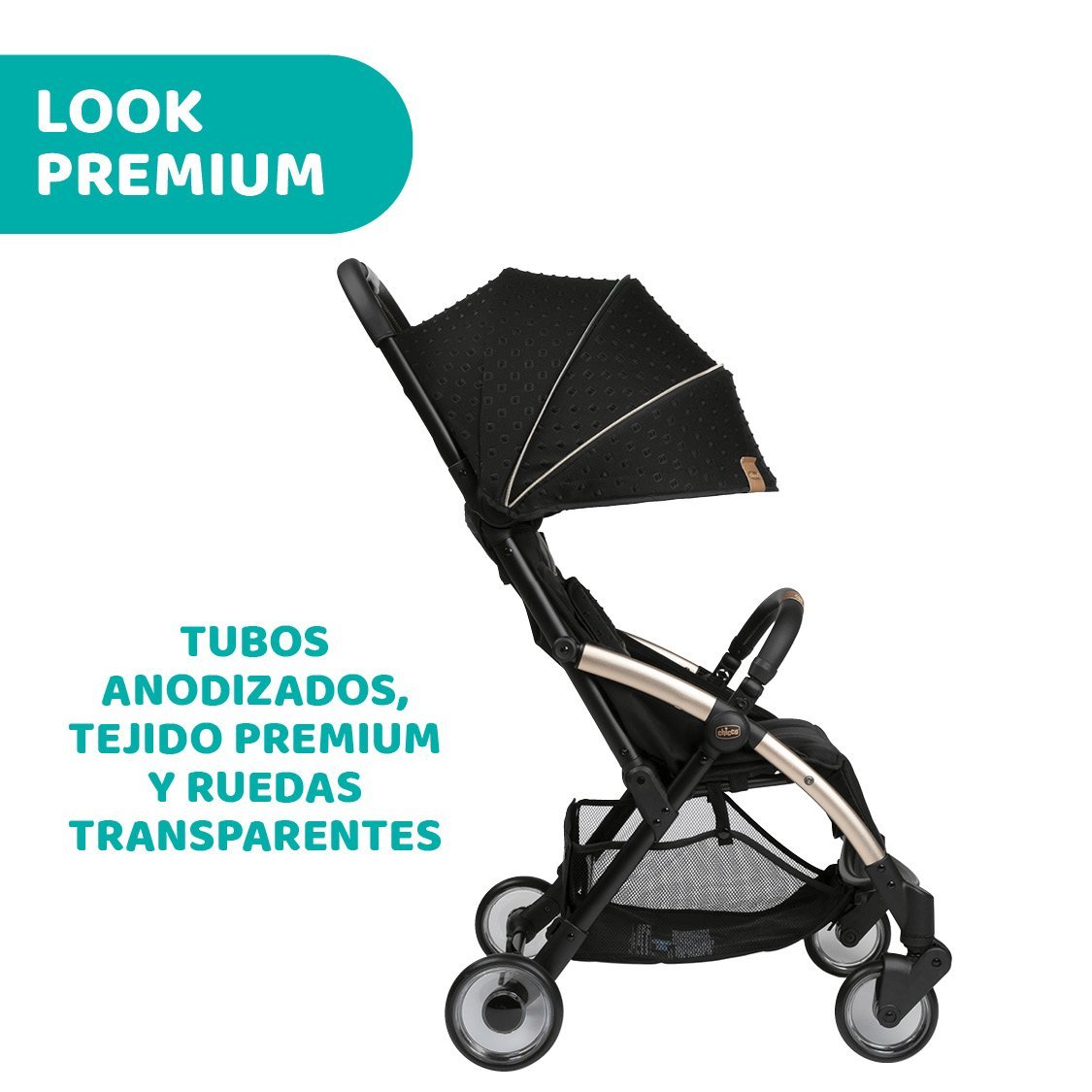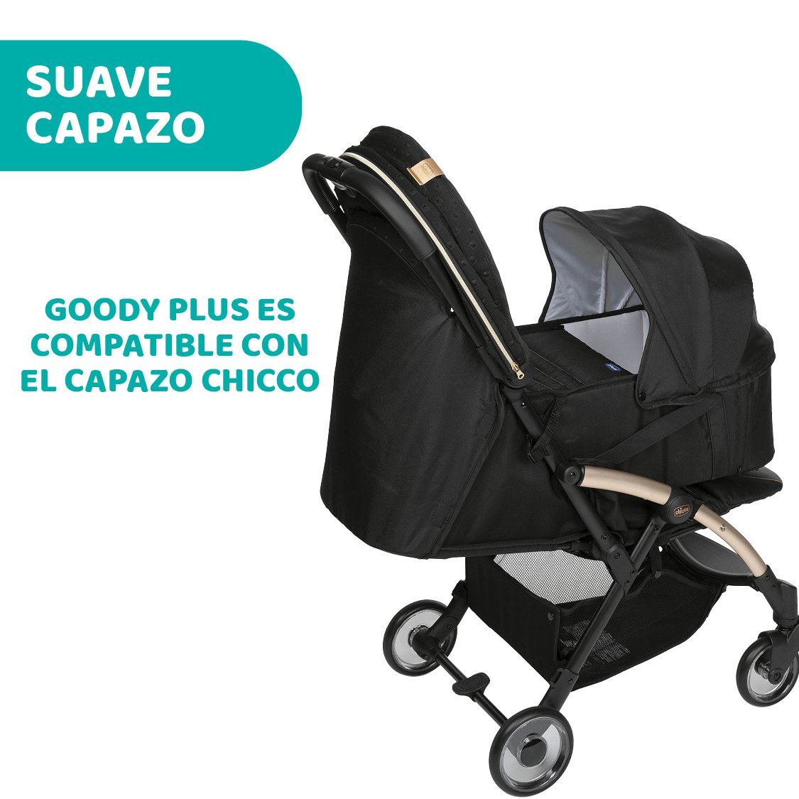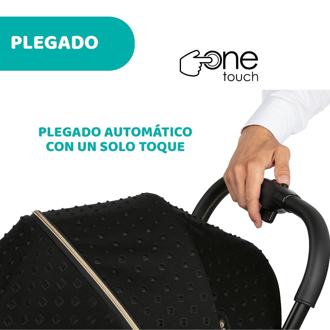 El 60% de los tejidos de esta versión Black Re-Lux están realizados en poliéster 100% reciclado, y la elegancia del color negro, junto con el efecto de tachuelas en 3D y el chasis dorada hacen convierten a Goody Plus Eco+ en un cochecito elegante y sostenible.