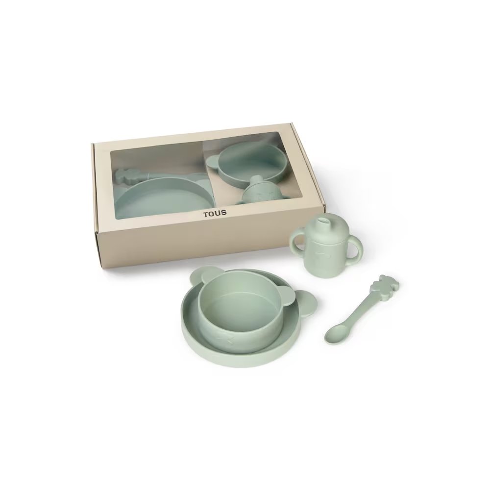 La vajilla 4 piezas de Tous está compuesta por taza con tapa y asas, plato, bol y cuchara. Es ideal para el aprendizaje y facilitar la alimentación del bebé.