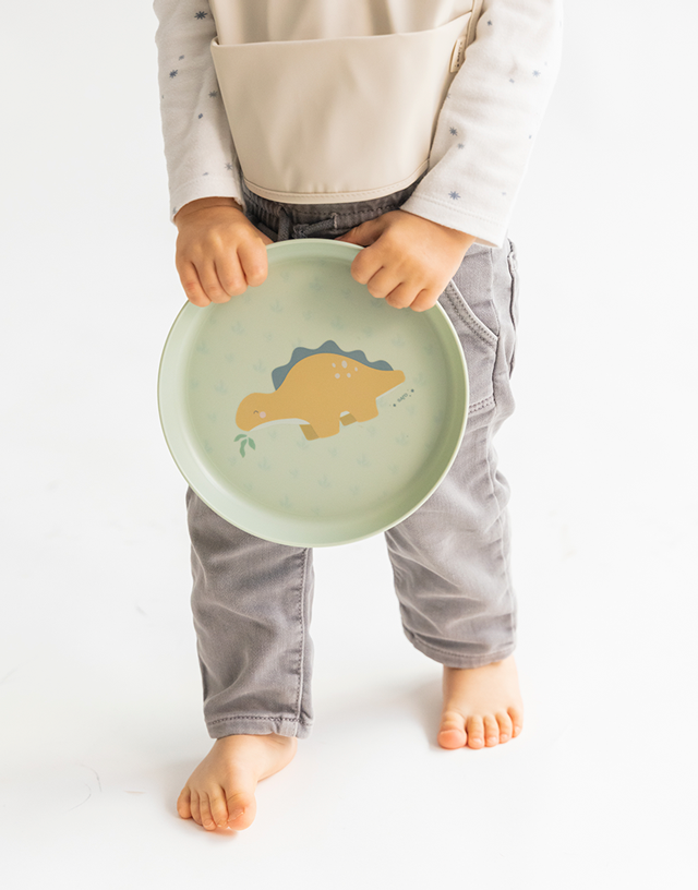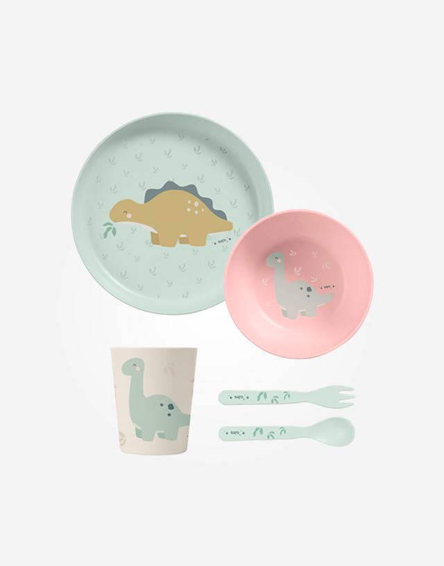 - Compuesta por plato, bol, vaso, cuchara y tenedor.
