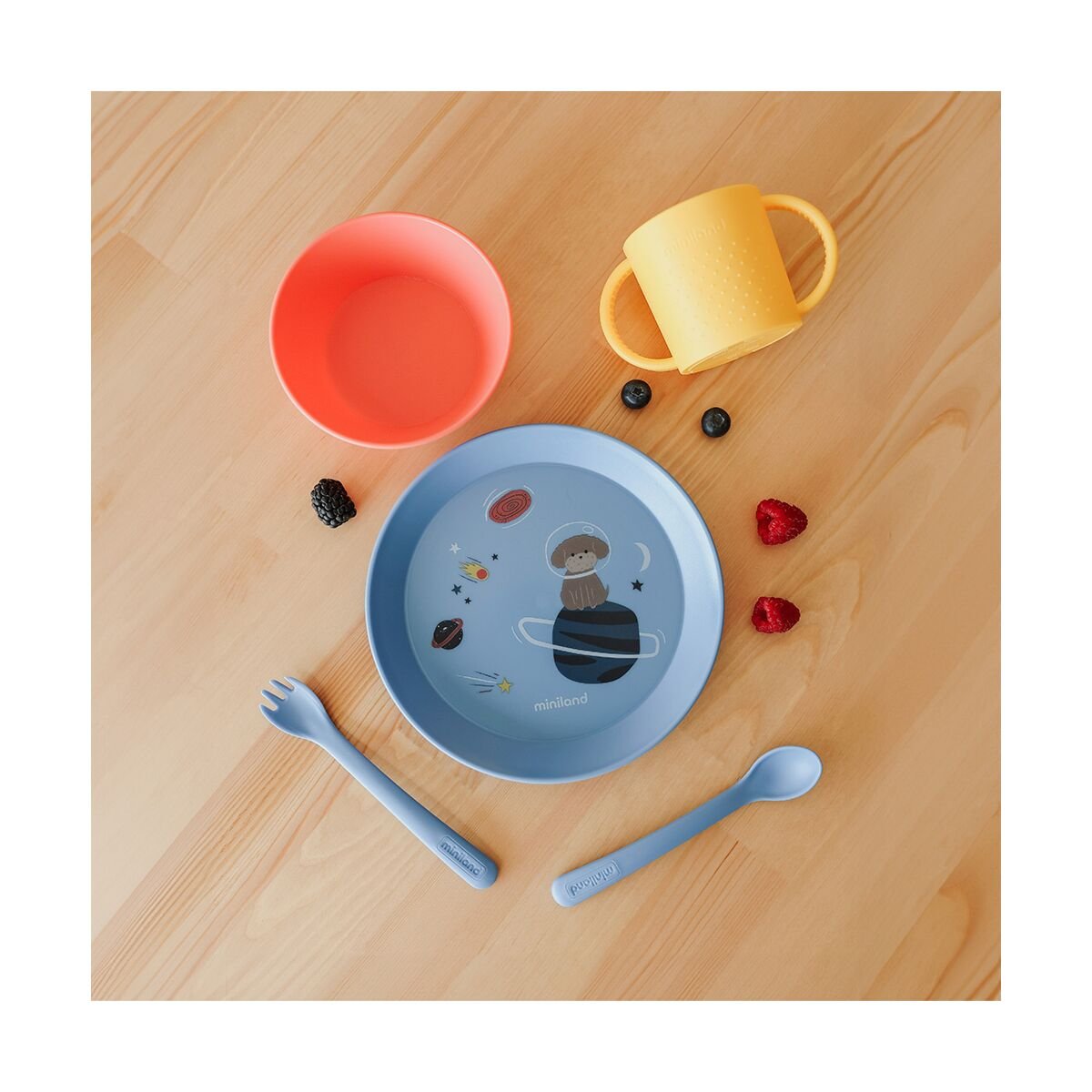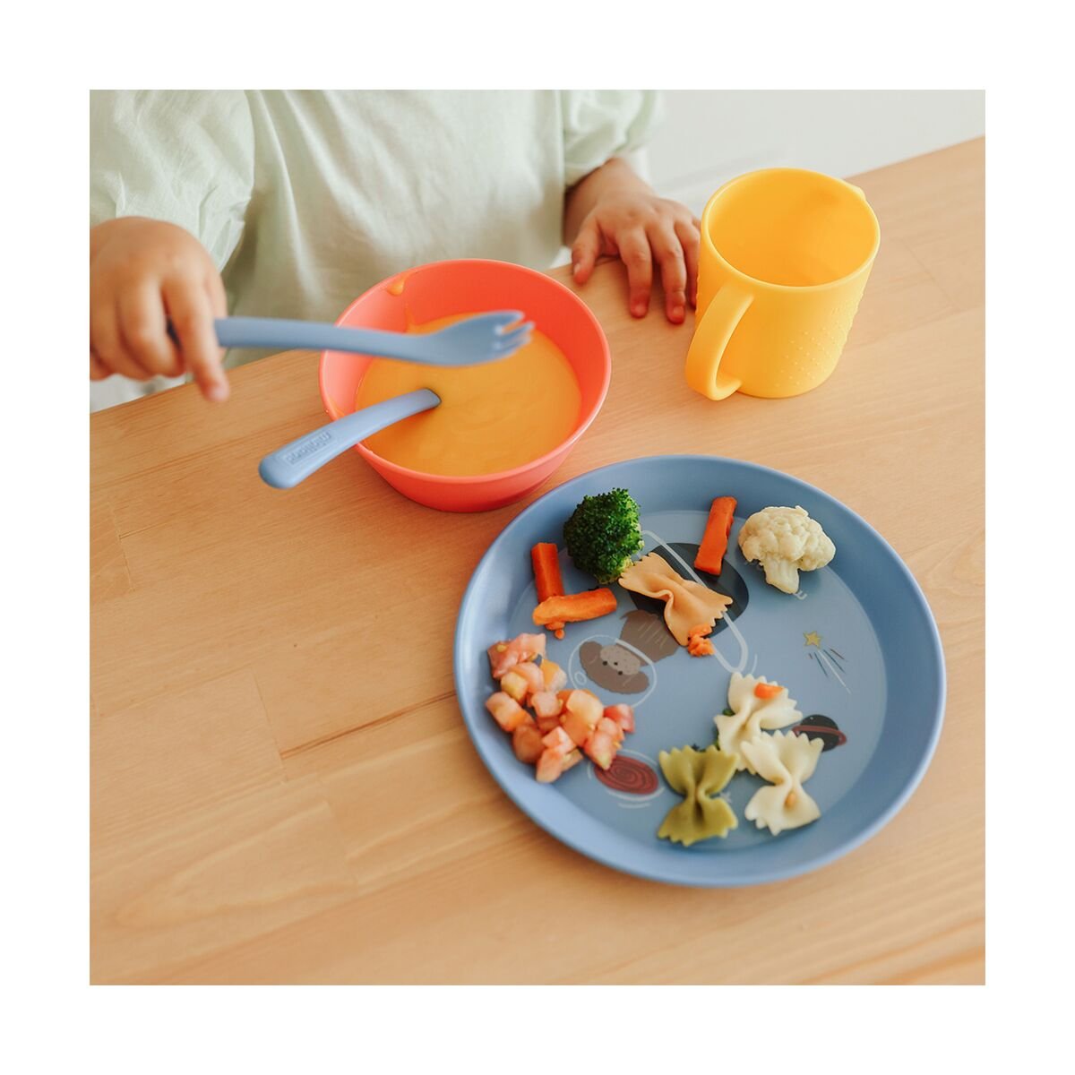 - Cuchara de gran capacidad y tenedor de puntas redondeadas.