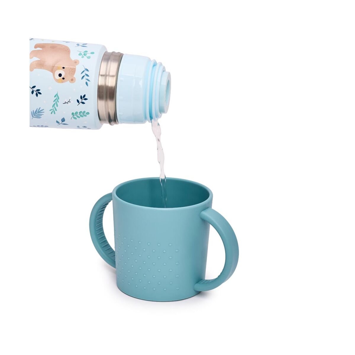 - El set incluye un vaso de fácil agarre, pensado para adaptarse a las manos pequeñas, así como piezas con bordes elevados, que ayudan a evitar derrames y facilitan la recogida de los alimentos. Estas características contribuyen a una experiencia de alimentación más limpia y controlada.