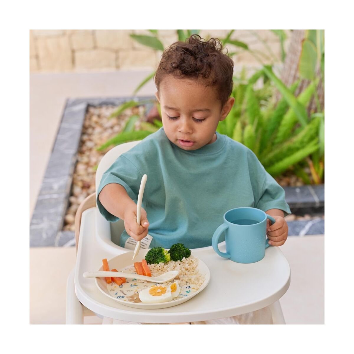 - Los cubiertos con bordes redondeados están diseñados para ofrecer seguridad durante el uso, evitando aristas y facilitando el manejo por parte del niño. Su forma ayuda a desarrollar la coordinación y la confianza al comer de forma independiente.